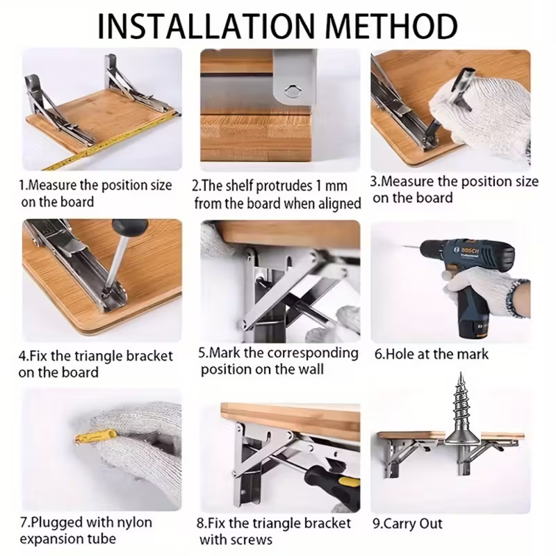 Tired of cluttered spaces but lack the room? Say no more! Our 2-PCS Heavy-Duty Adjustable Folding Brackets are here to revolutionize your home and workspace. It’s not just a bracket — it’s your smart space-saving partner!